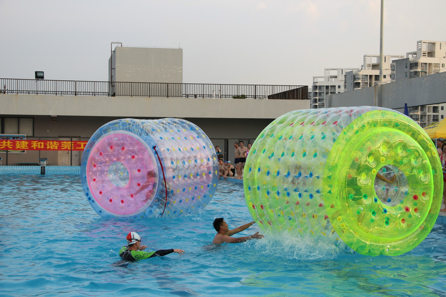 比赛当日艳阳高照,气温更是高达34℃。骄阳似火但大家热情不减。个人比赛的紧张激烈引得岸边加油声不断,团体组的对抗让各分工会教工激动万分。本次水上趣味运动会结合往届的经验,经过工会工作会议讨论,设了40岁以下组(含40岁)和40岁以上组两个组别;团体赛设了赛龙舟、水上滚筒、水中拔河三个项目。