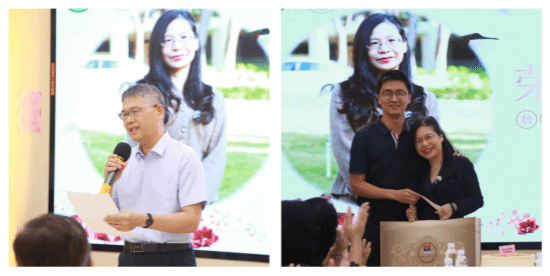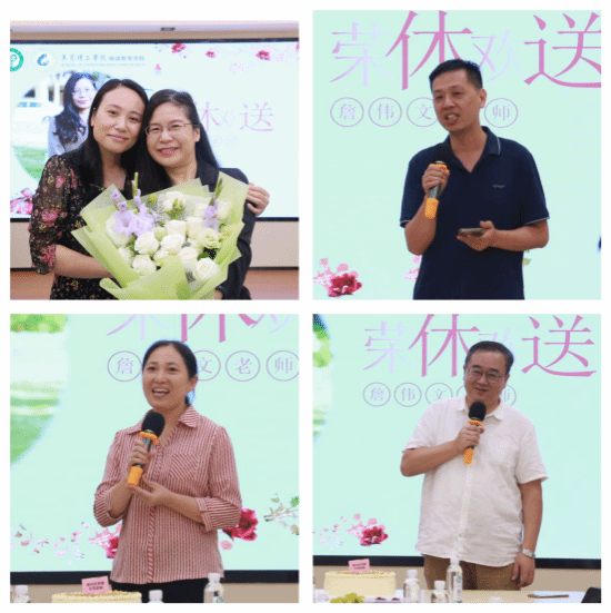 同事代表王小婷向詹老师赠送了献花,莫灼英、李利琴和吴华斌三位老师分别为詹伟文老师表达了诚挚的祝福和由衷的感谢。