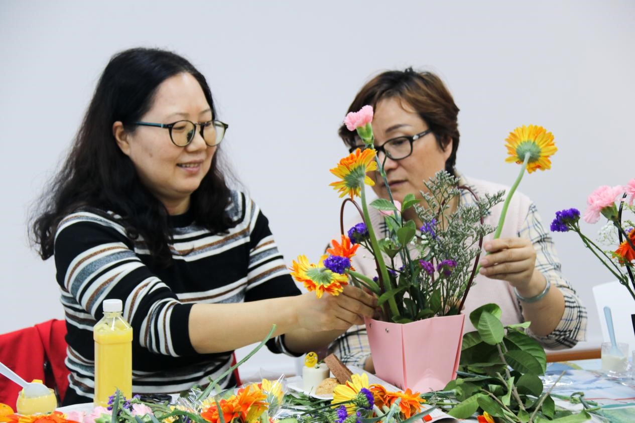 女教师们用自己灵巧的双手,尽情发挥创造力,整合造型。原本普通的花草在老师们修剪后,错落有致地搭配成一束束漂亮美丽、散发着艺术美感的鲜花。