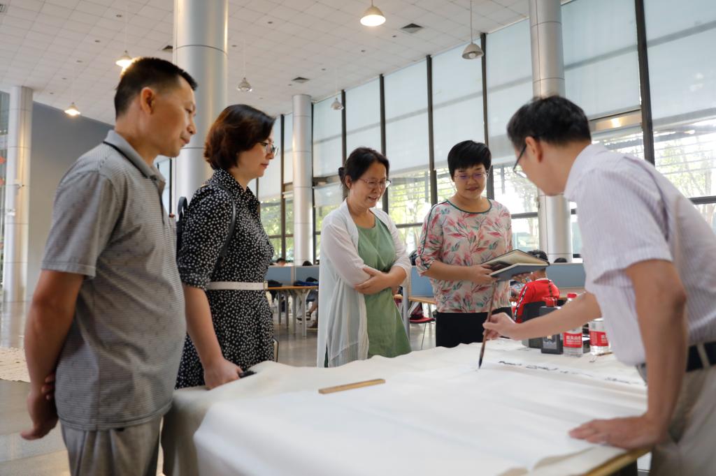 为了庆祝新中国成立70周年,弘扬中华优秀传统文化,用书画艺术形式表达我校师生对祖国母亲的爱, 2019年6月27日下午, “3044am永利集团官网庆祝新中国成立70周年书画现场笔会”在图书馆一楼大厅顺利举行。本次书画现场笔会由校工会主办、校教职工书画协会承办,活动主题是“书画寄情颂七十华诞,挥毫泼墨抒爱国情怀”。活动吸引了几十名师生到现场观看。