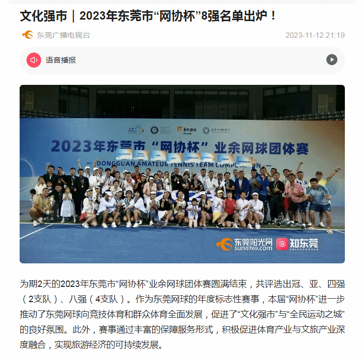11月11日至12日,为期2天的由东莞市文化广电旅游体育局指导,东莞网球协会主办、东莞市滨江体育公园管理所协办,共同倾力打造的2023年东莞市“网协杯”业余网球团体赛在东莞市网球中心拉开序幕。我校东莞理工天福队队员精诚团结、奋力拼搏,呈现了一场又一场无比精彩的角逐,最终突出重围,摘得桂冠。