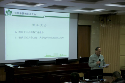 按照校工会工作要求,法社学院此次教职工大会分为两个阶段进行,第一阶段召开预备大会,分工会主席汪辉勇教授作教职工大会筹备工作报告,紧接着,全体教职工举手对此次正式大会的议题、选举办法及监票人名单进行了表决,全体通过。